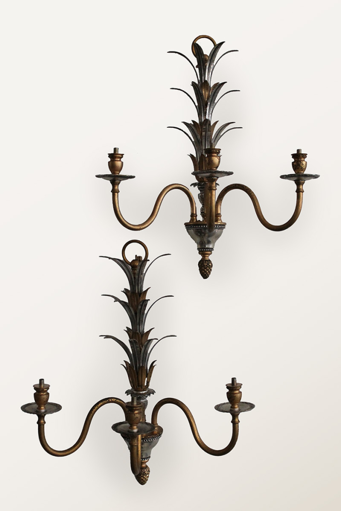 A set of 4 two - tone palm effect Maison Charles 3 arm wall lights c. 1920