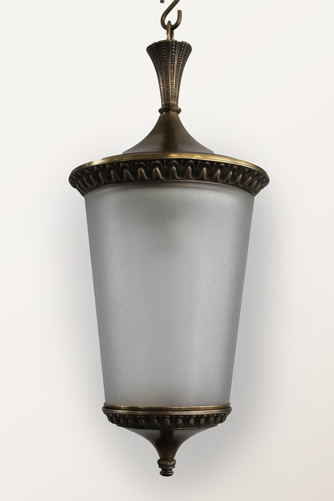 A pair of Italian frosted glass and antique brass tapering Deco classic hanging lights c. 1920