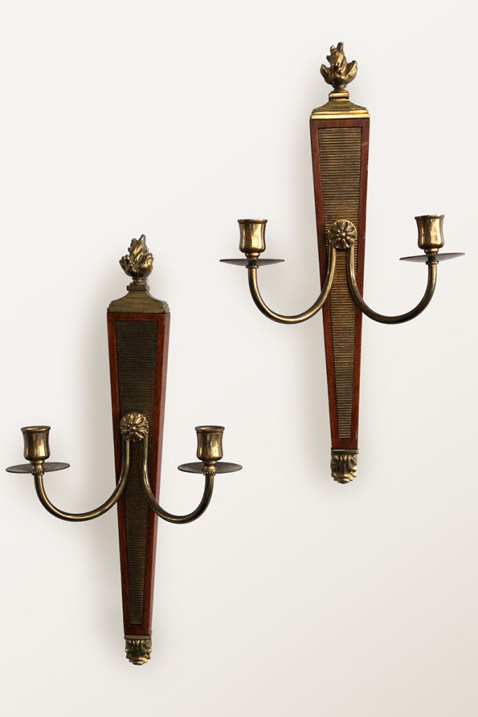 A set of 4 French mahogany and antique brass wall lights c. 1920