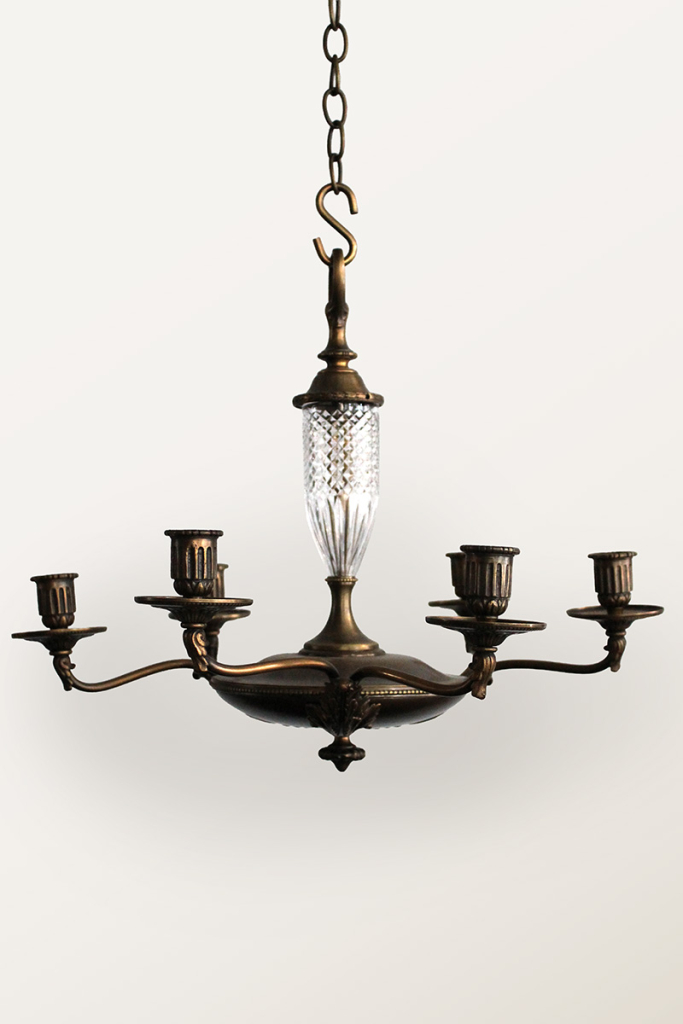 A pair of English 6 arm cut glass and antique brass chandeliers c. 1920