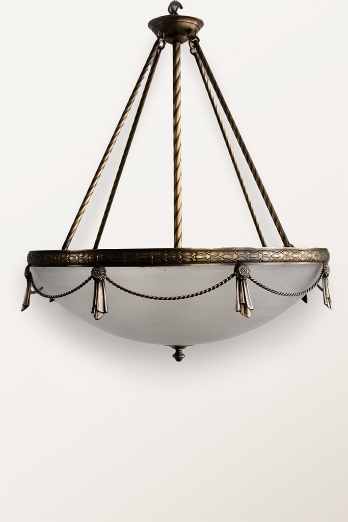 A pair of Italian antique brass and frosted glass classical hanging lights c. 1950