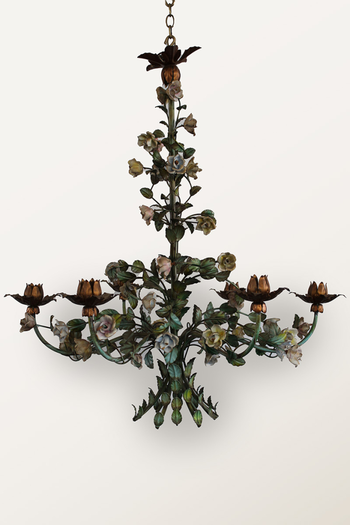 An Italian painted 6 arm chandelier with porcelian flowers c. 1940